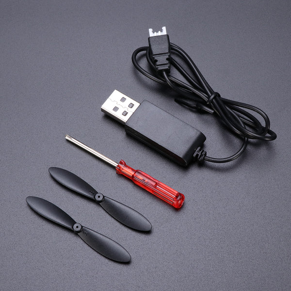 - Package Contents: 1 x Quadcopter (Battery Included), 1 x USB Cable, 4 x Spare Propeller, 1 x Screwdriver, 1 x English Manual