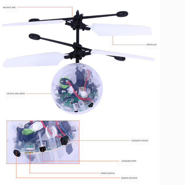 It is like a toy helicopter but instead of the usual helicopter cabin and body it features a clear glass ball. When you turn on it, it will emitting a brilliant light, very beautiful!